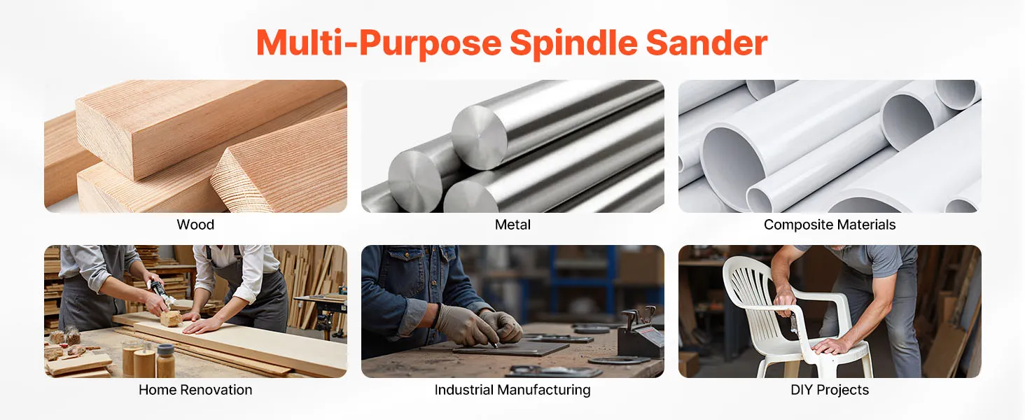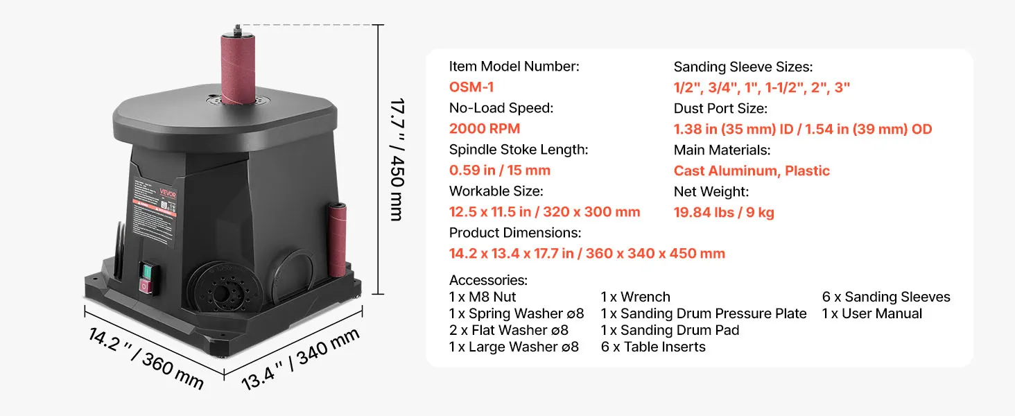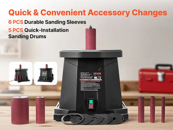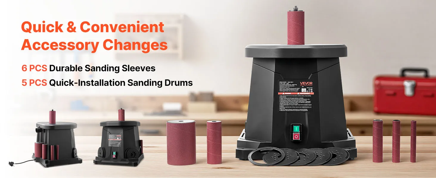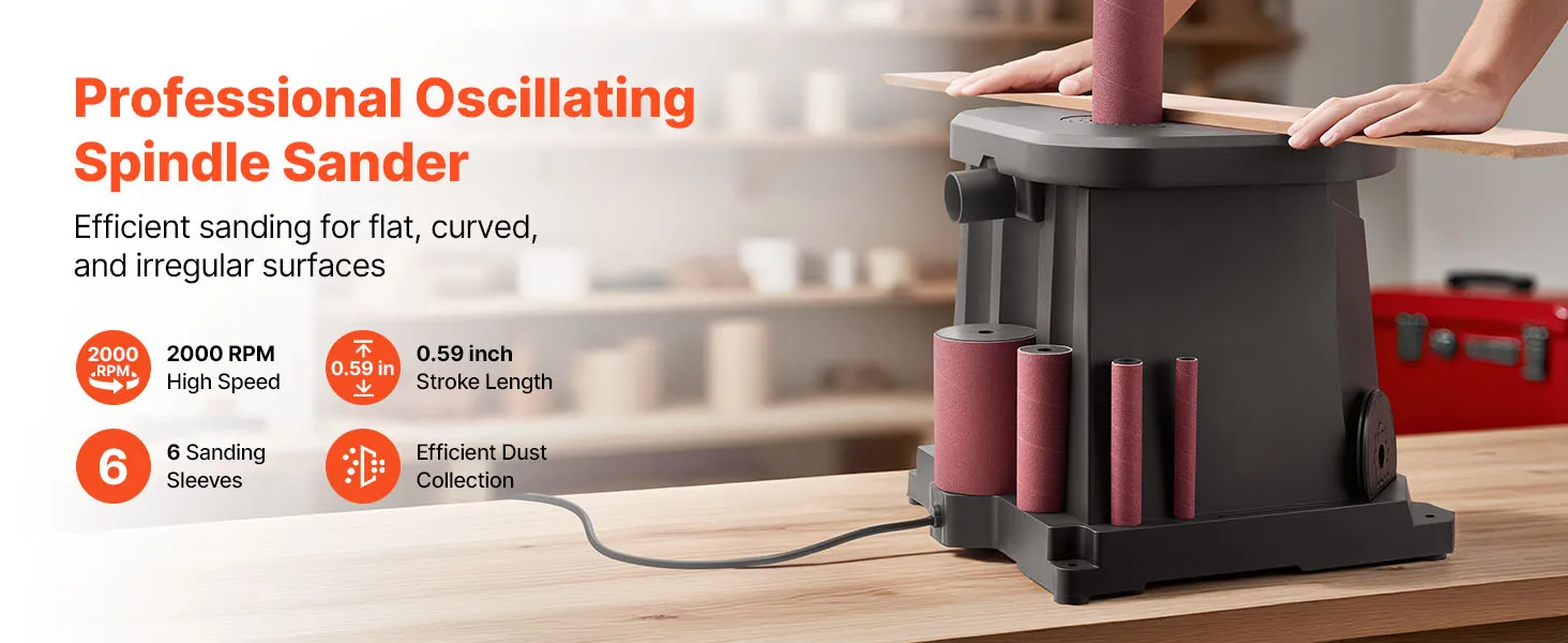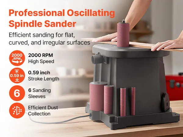 Whether for furniture sanding or DIY projects, this oscillating spindle sander delivers a smooth experience. With a 2000 RPM high speed, 6 sanding sleeves, a 15mm stroke length, and a wide cast aluminum worktable, it ensures more precise and efficient sanding for smooth finishes.