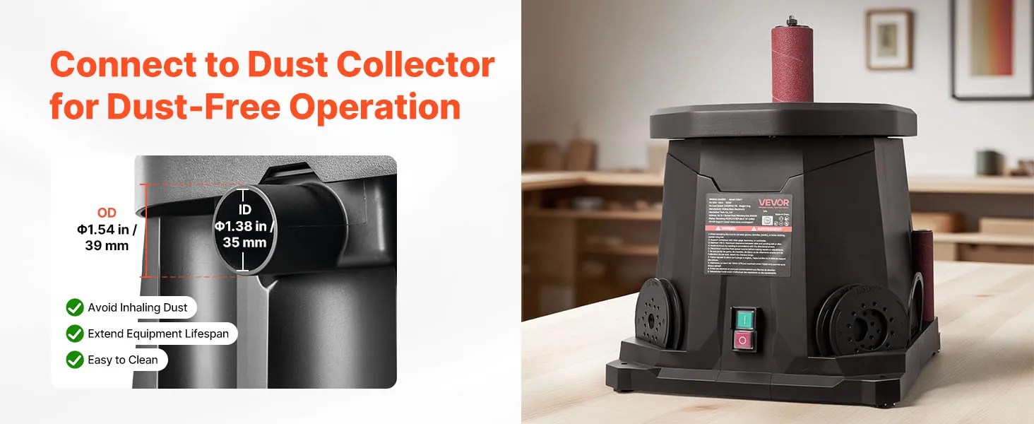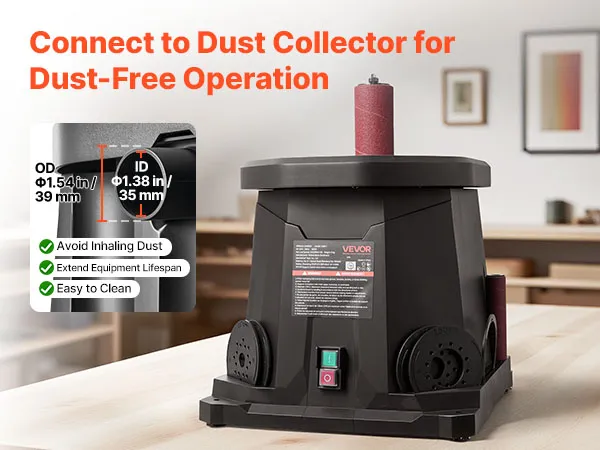 Equipped with a 35mm (ID) and 39mm (OD) dust port, the spindle sander connects easily to vacuum hoses for dust-free operation, reducing cleanup, extending equipment life, and keeping your workspace clean.