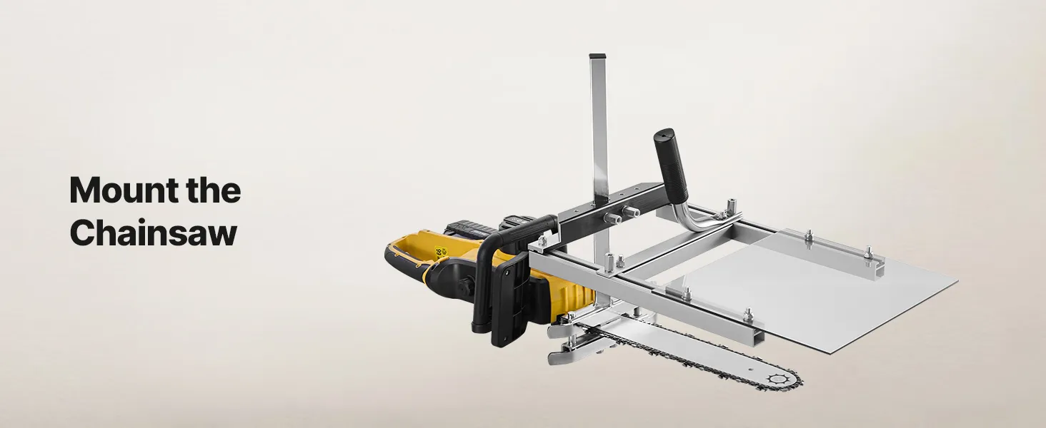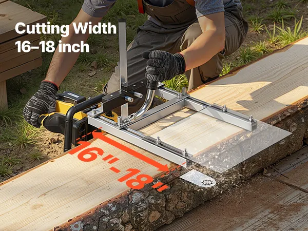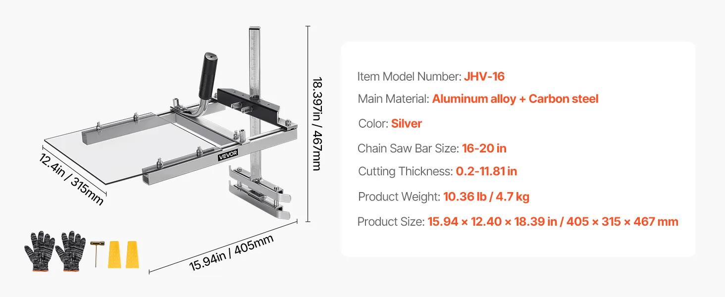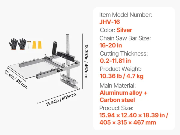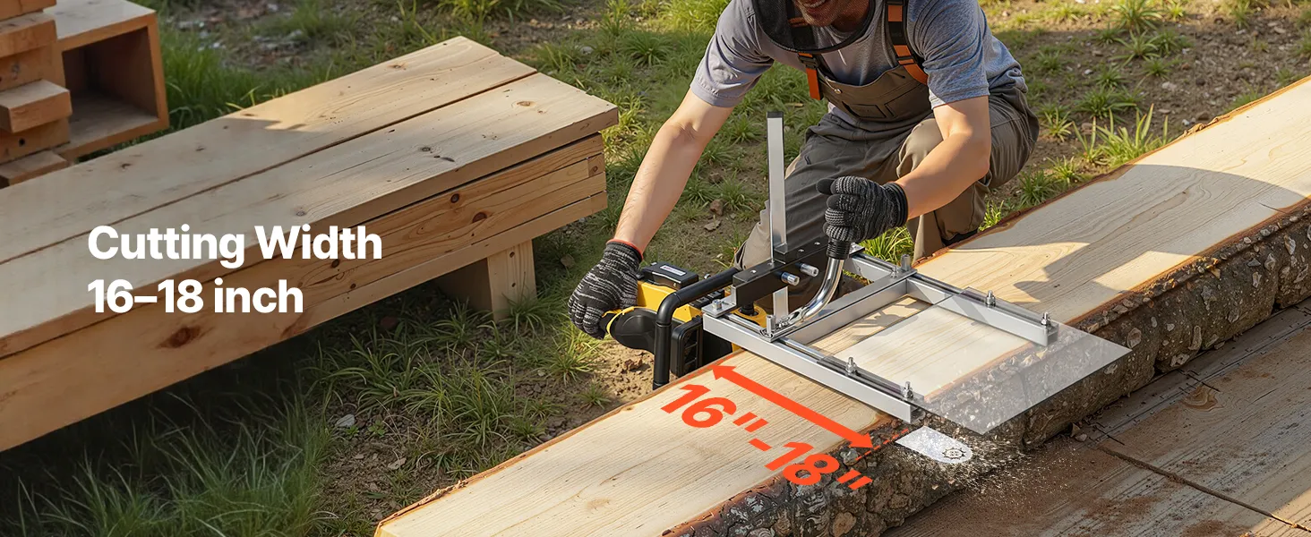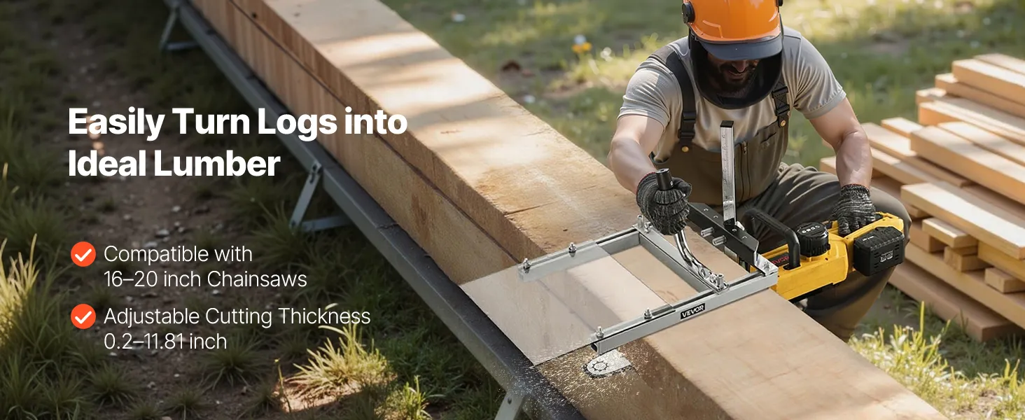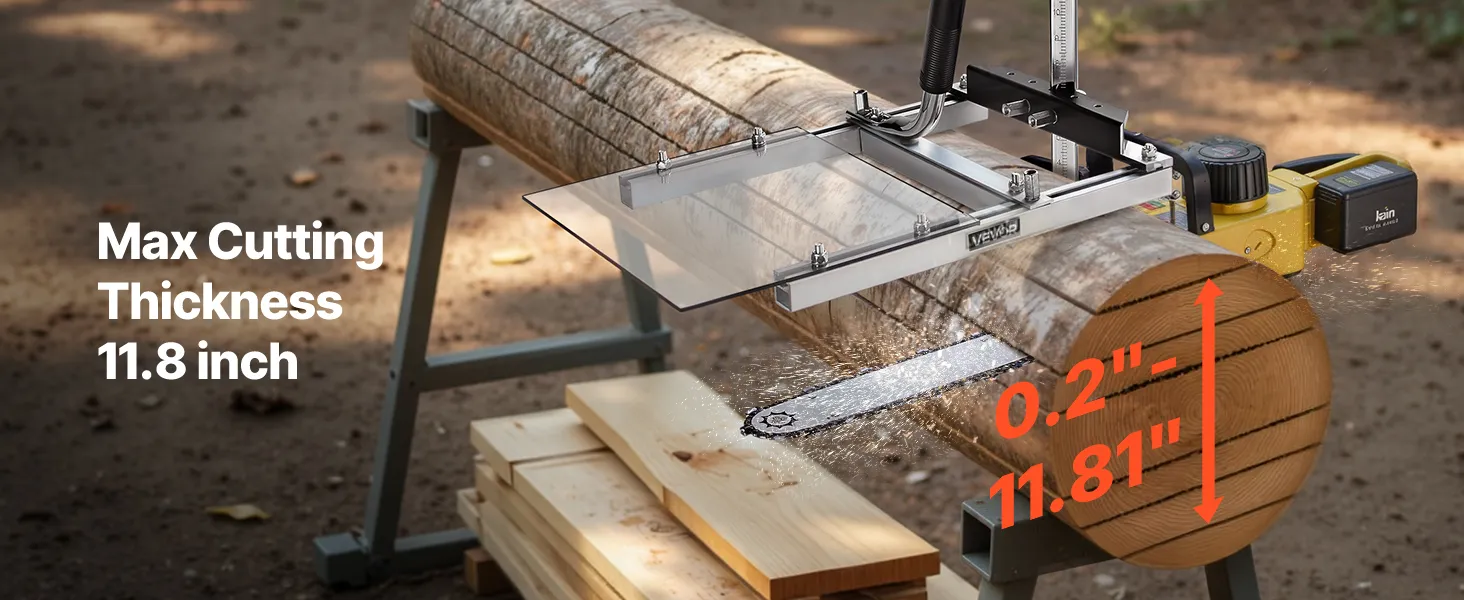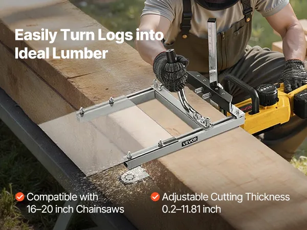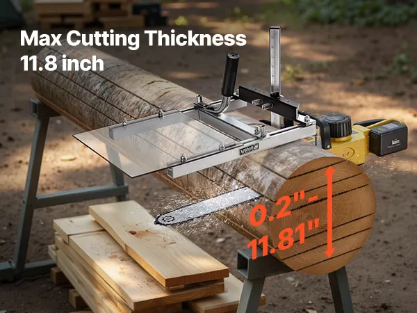 The chainsaw mill is compatible with chainsaw guide bars from 16–20 inches, with a thickness adjustment from 0.2 to 11.81 inches to suit various types of wood and cutting needs