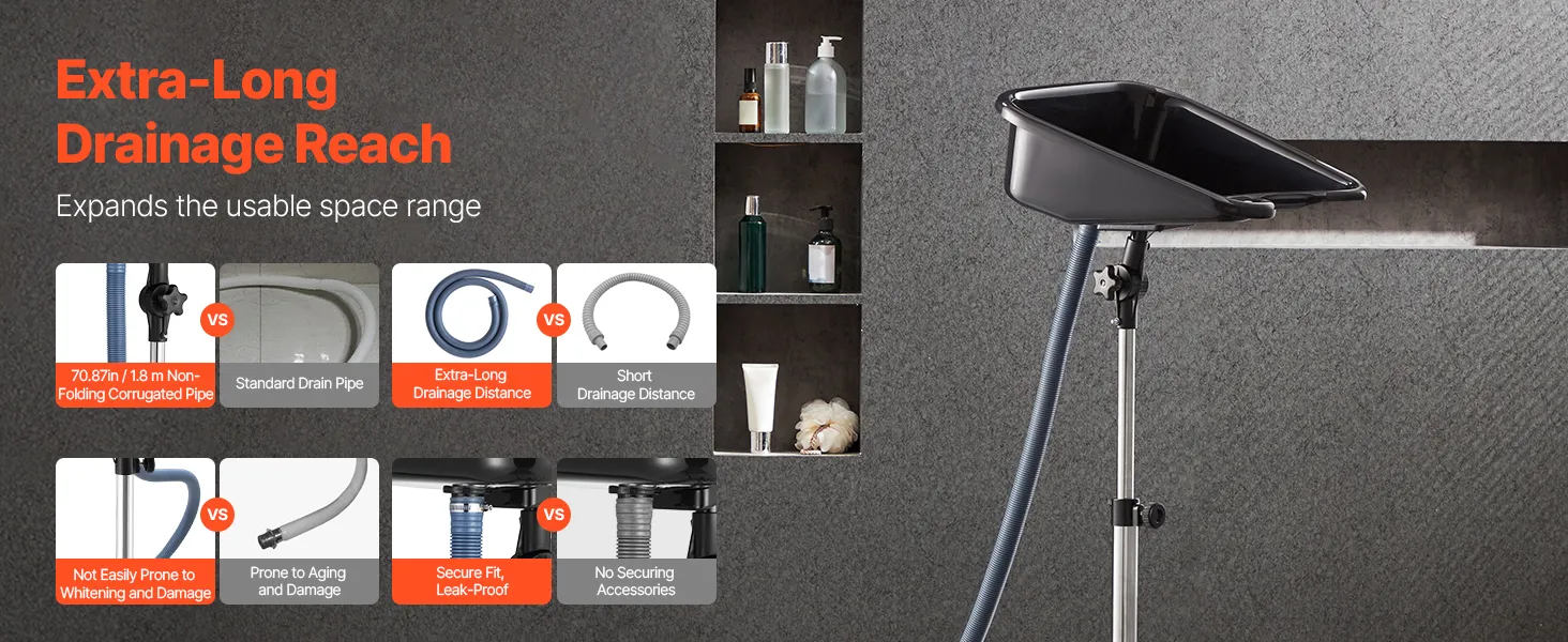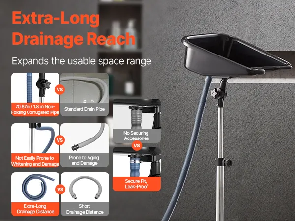 The portable salon sink comes with a 70.87 in/1.8m extended non-collapsible corrugated pipe, also durable and not prone to whitening or damage. This extension increases the drainage range, providing greater flexibility for your drainage needs.
