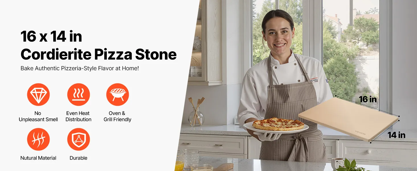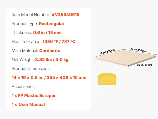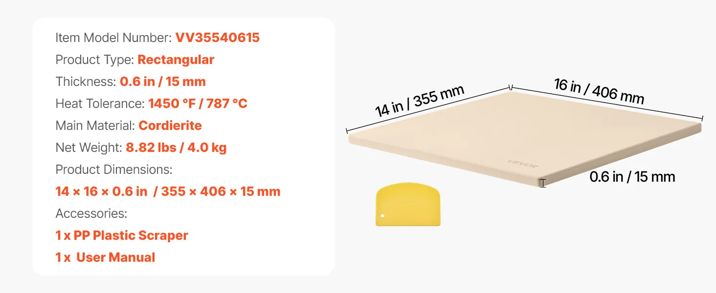 VEVOR Rectangular Cordierite Pizza Stone 406×355 mm, 15 mm Thick, Heat-Resistant with Scraper, for Oven, BBQ, Bread & Pizza