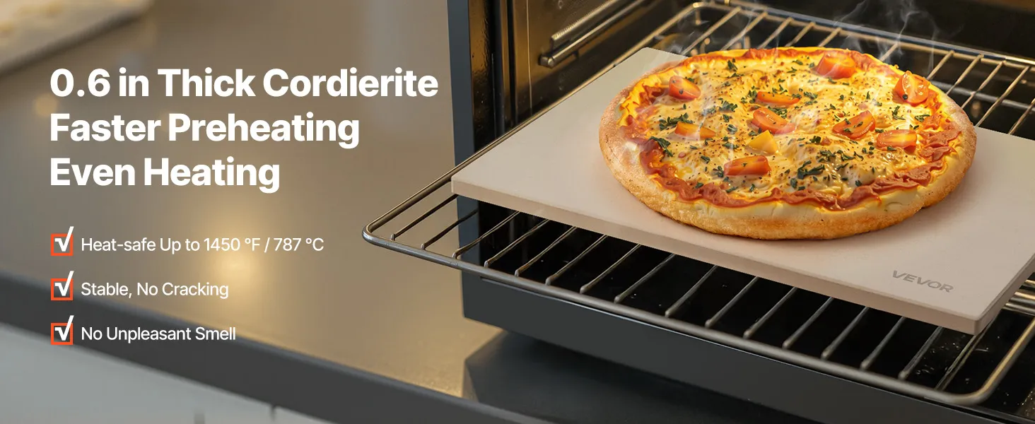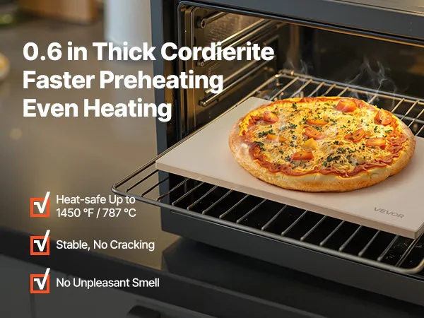 • Heat-Resistant Cordierite: Our 0.6 in/15 mm thickened cordierite rectangular pizza stone can withstand up to 1450°F/787°C without warping or cracking. It stores heat longer, shortens preheating. No unpleasant smells during baking
