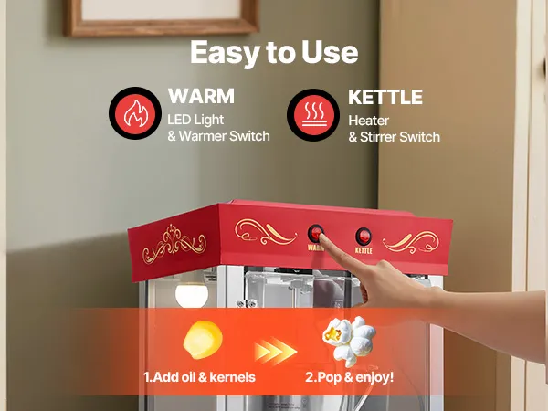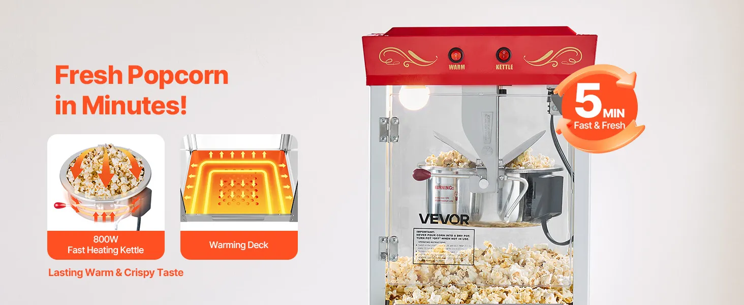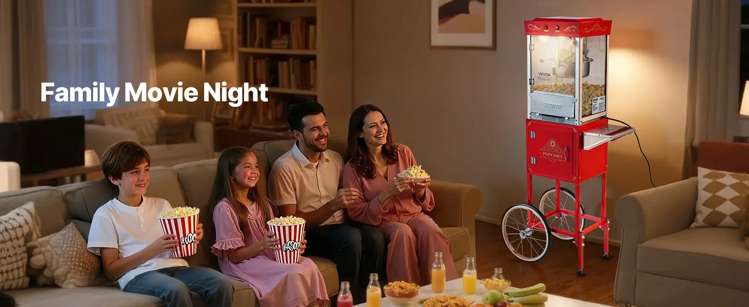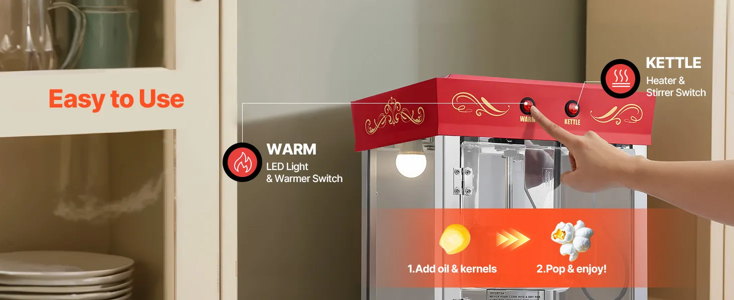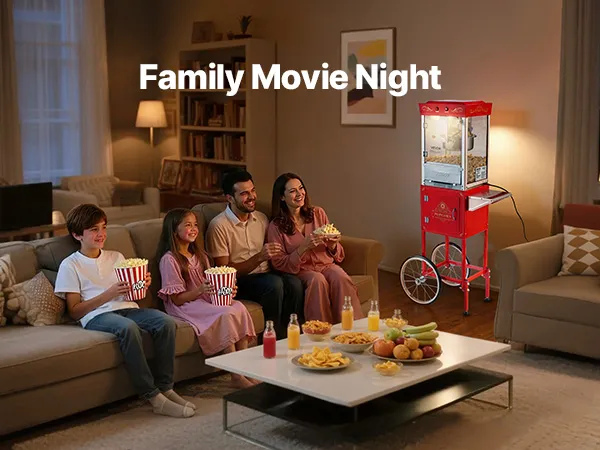 Q1: How do I keep my popcorn from being unpopped and having a soft, burnt texture?A1: Unpopped kernels, soft or burnt corn are caused by insufficient oil. We provide a recipe guide for reference. Another reason is using high-humidity corn, switching to low-humidity one can resolve this. Condensation on the walls during use is normal.Q2: Is the popcorn machine easy to disassemble and clean? A2: Our popcorn machine features tool-free detachable parts (kettle, kernel catcher) for cleaning in seconds.Q3: Can I use this outdoors for events?A3: Yes! The machine is built for both indoor and outdoor use. Pair it with our dust-proof lid for outdoor events like carnivals or backyard parties.