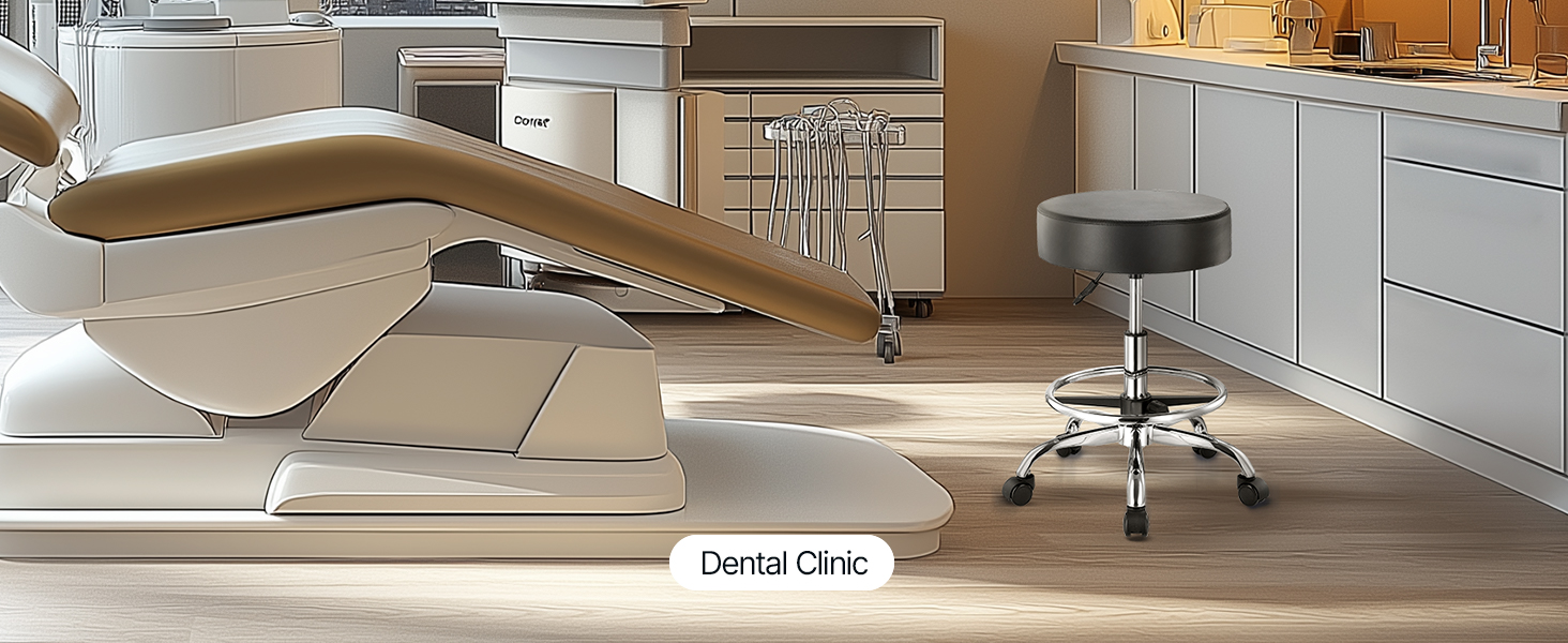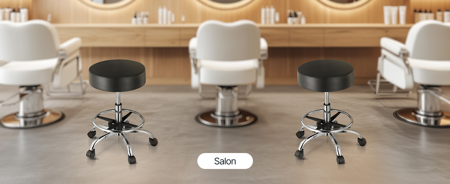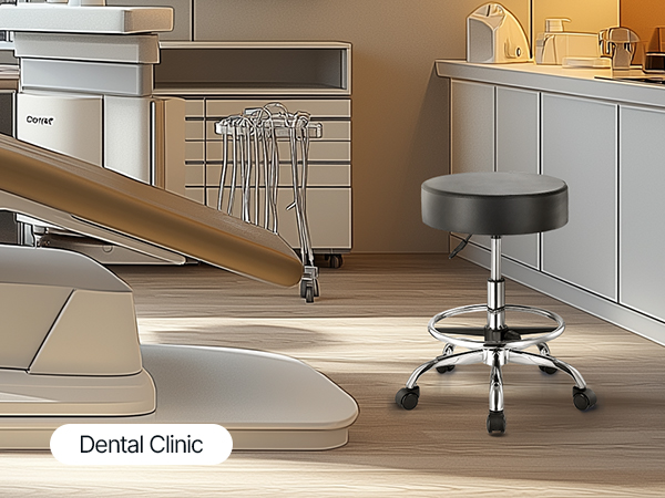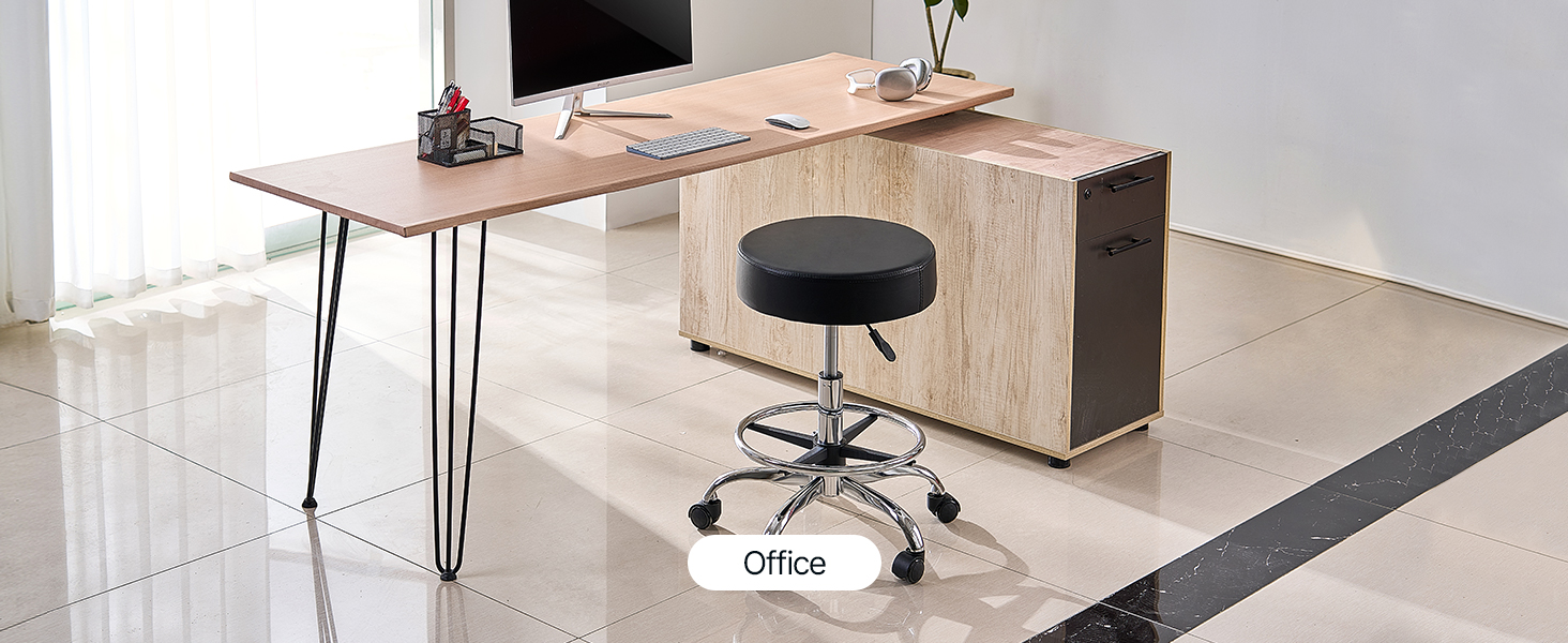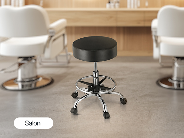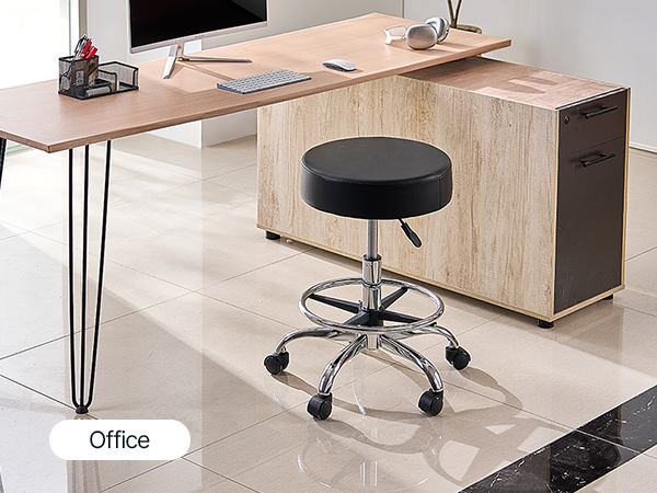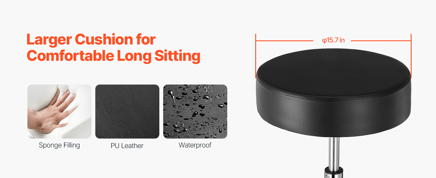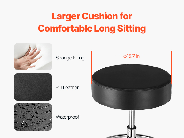 Our rolling stool is made of high-density compressed foam. The cushion measures φ15.7 x 3.9 in, and the leather seat is waterproof and breathable, providing extra comfort for long periods of sitting.