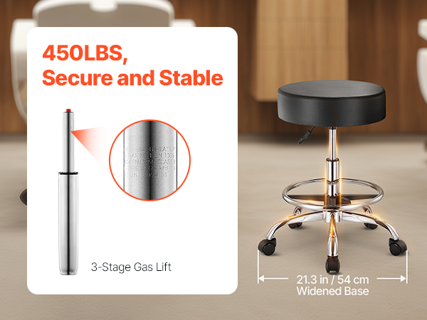 This office stool base has a 21.3in / 54.9 cm diameter, with a sturdy metal structure that supports up to 450 lbs. It also features an SGS-certified three-stage hydraulic gas lift, ensuring durability without concern for metal bending.