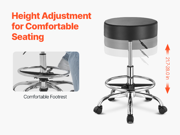 VEVOR Rolling Stool with Foot Rest and Wheels, 450 LBS Weight Capacity Round Rolling Stool Chair, Height Adjustable Thickened PU Leather Swivel Stool for Salon, Spa, Massage, Tattoo, Clinic, Black