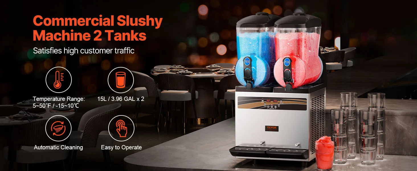 With two 15L / 3.96 GAL capacity tanks, this slushy machine can make approximately 120 cups of slushy drinks per batch, you can choose to use each tank independently (recommended sugar content: around 13%, alcohol content: below 13%). It requires less frequent refilling, making it perfect for high-traffic commercial use. The transparent tank beautifully showcases colorful drinks, making it a great fit for ice cream shops, burger joints, cafes, bars, and other commercial settings.