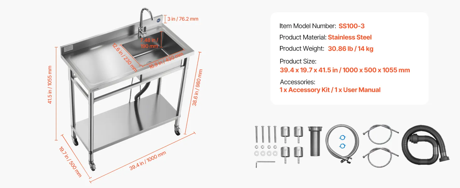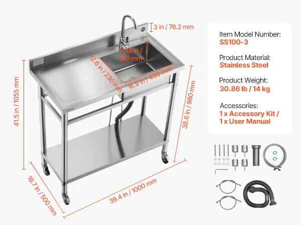 VEVOR Stainless Steel Utility Sink, Rolling Single Bowl Commercial Kitchen Sink with Wheels, Faucet and Hot & Cold Water Pipe, Utility Basin Workbench for Garage Restaurant Laundry 1000 x 500 x 1055mm