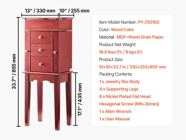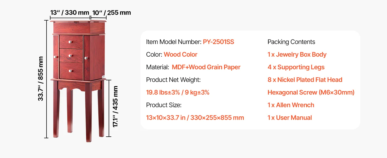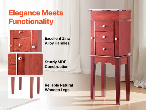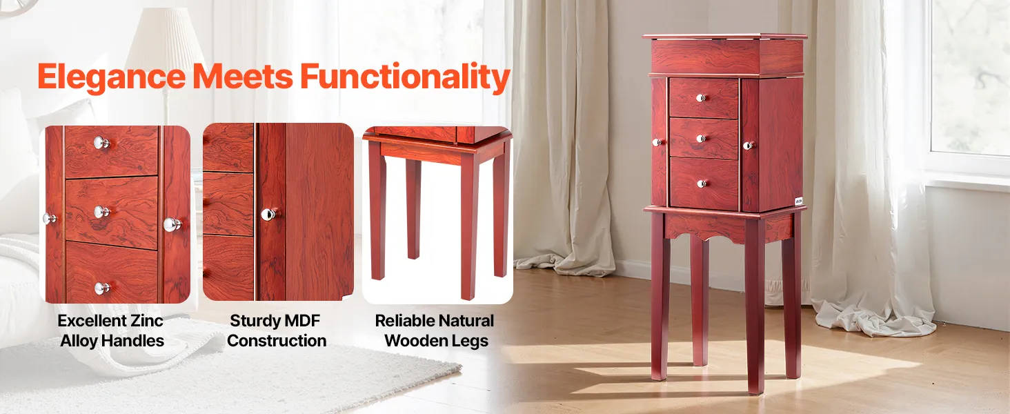 • Elegance Meets Durability: This jewelry armoire features high-quality metal handles, sturdy MDF construction, and durable wooden legs, providing exceptional quality, durability, and elegance