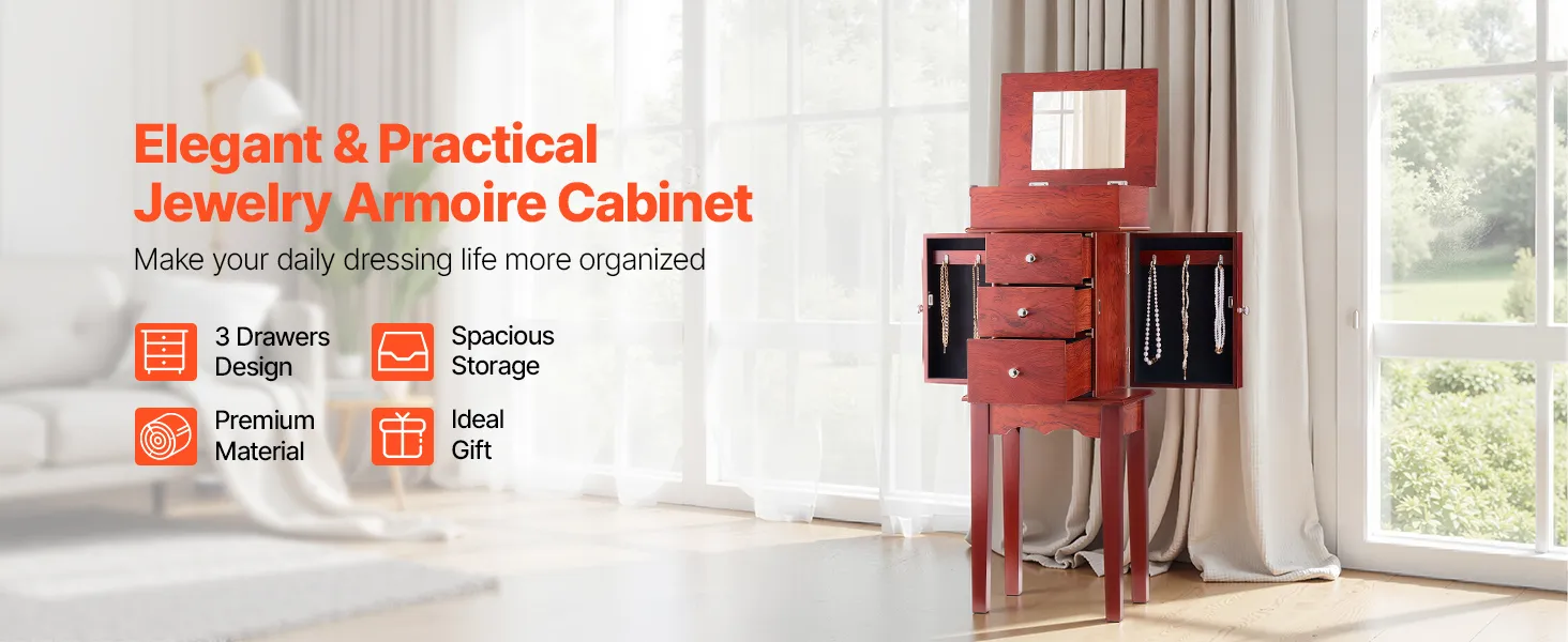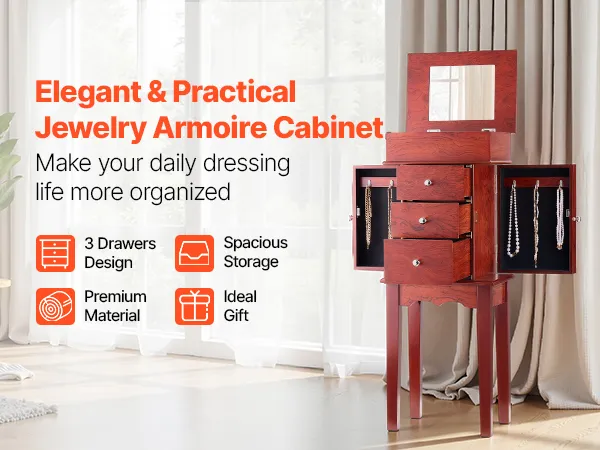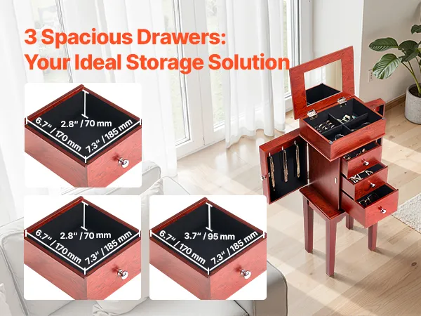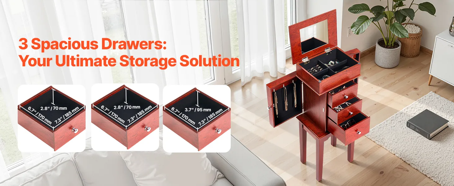 • Large Capacity Drawers: This standing jewelry armoire has 3 spacious drawers, ideal for organizing jewelry for both everyday wear and special occasions
