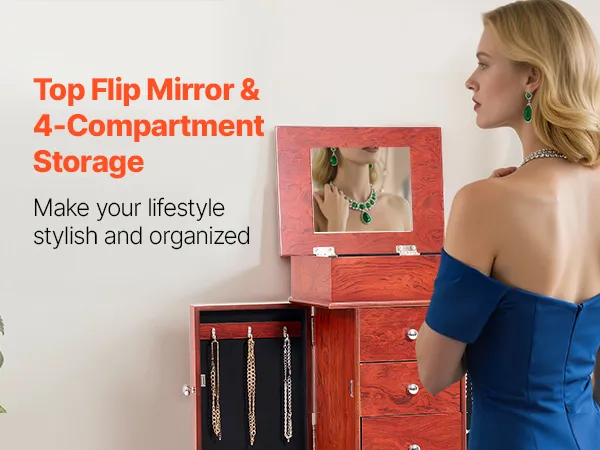 • Top Flip Mirror: The flip-open mirror and 4-compartment tray with ring slots provide instant visibility and easy access, making jewelry pairing effortless and elegant