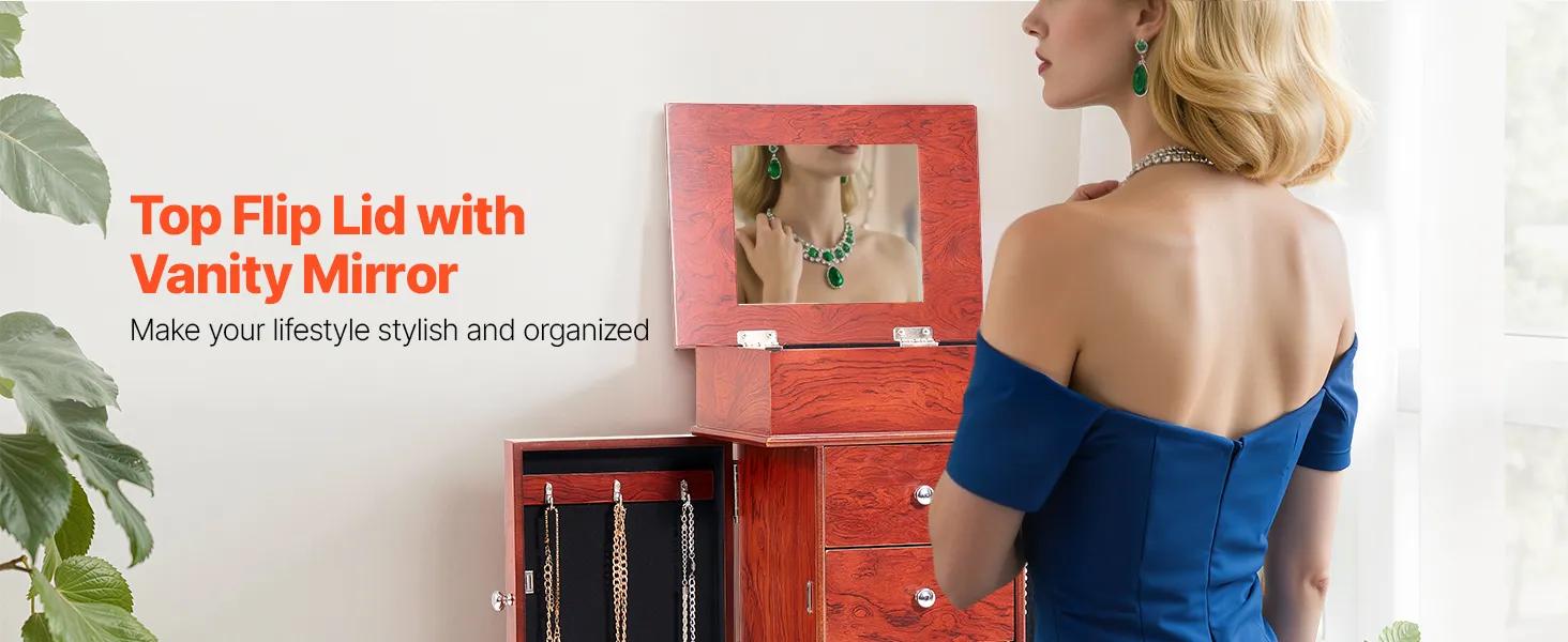 Дерев'яна шафка для прикрас VEVOR з дзеркалом, 3 шухлядами, 4 відділеннями та гачками для намист