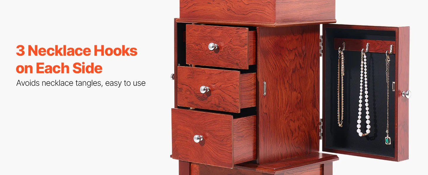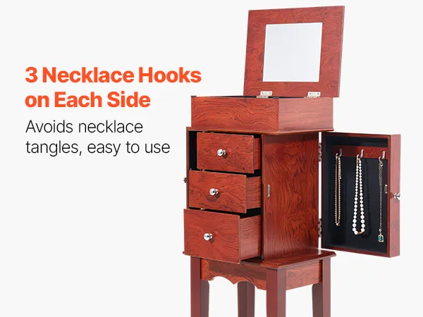 • Tangle-Free Necklace Hooks: Our standing jewelry box features 3 hooks on each side, ideally sized for long necklaces, allowing for clear display and easy access