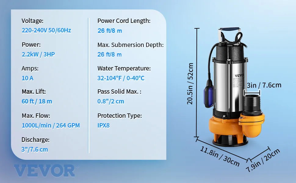The submersible pump features a large 3"/7.6 cm discharge to outlet more water and is easy to connect hose. It can handle with 32-104℉ / 0-40℃ water contains solids up to 0.8"/2 cm.