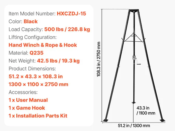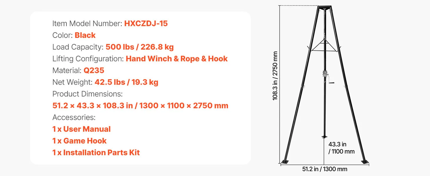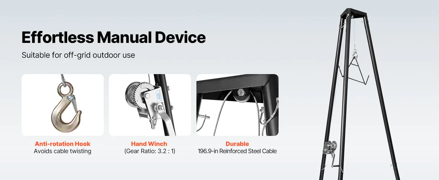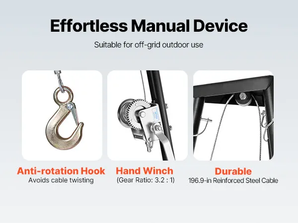 Powered by a high-capacity manual winch, our deer game hoist allows you to easily lift up to 500 lbs, making it ideal for lifting game or heavy items in outdoor environments.