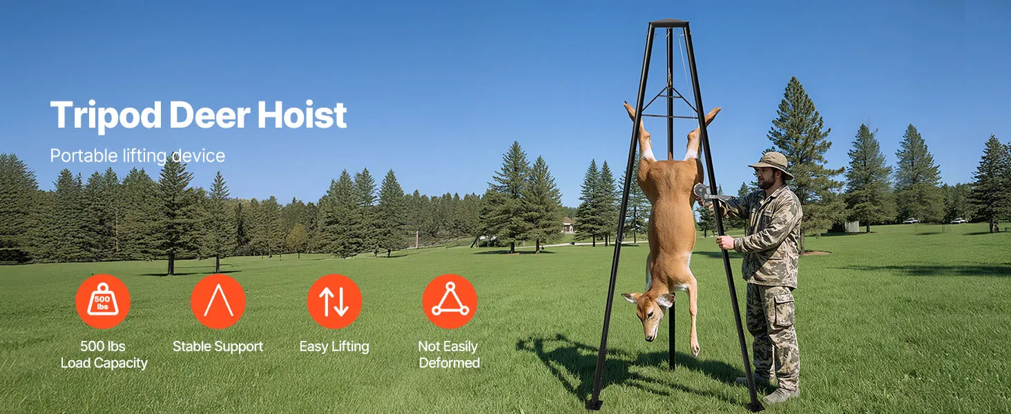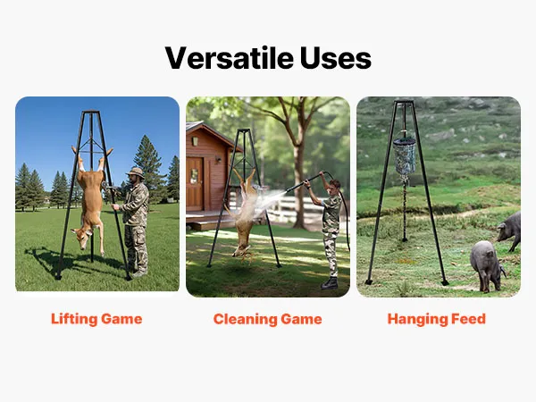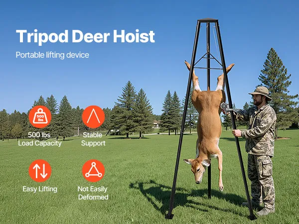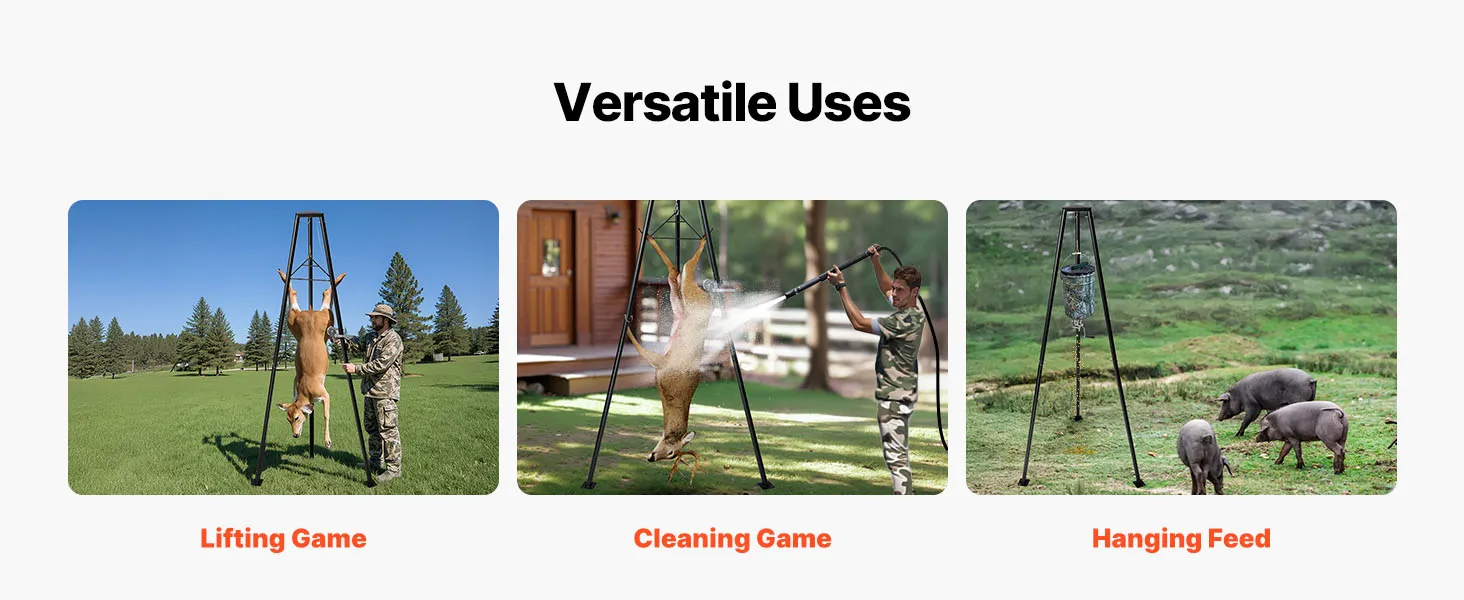 This portable game hoist features a triangular support design, offering great stability and a weight capacity of up to 500 lbs.