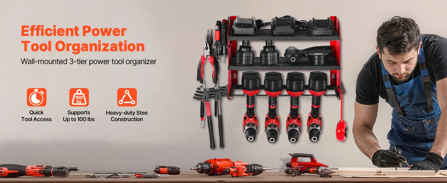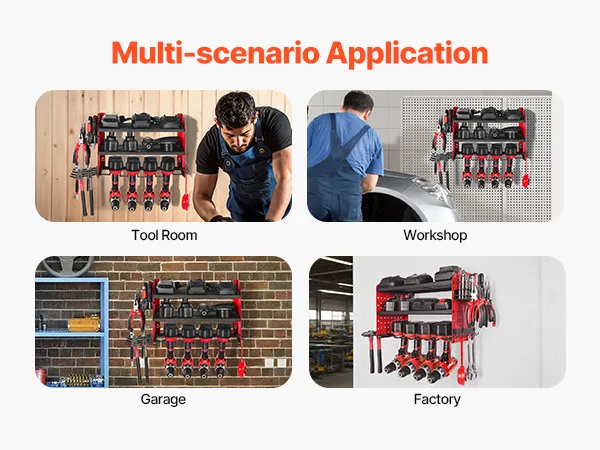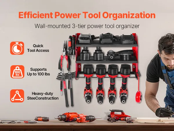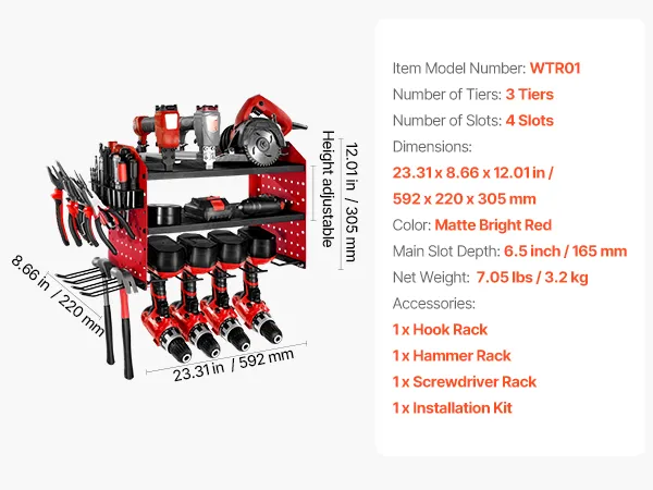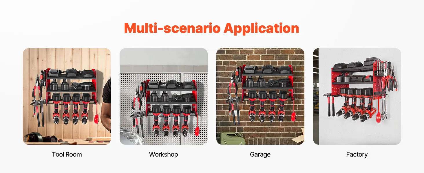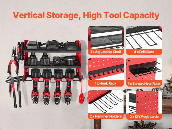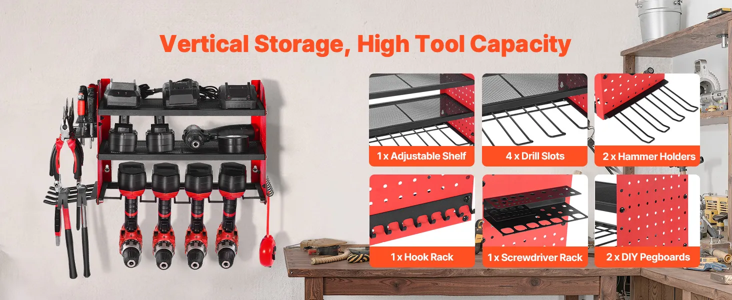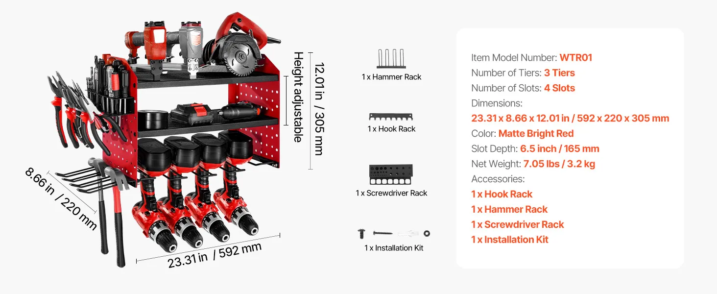 • Efficient Storage: This 3-tier wall-mounted power tool rack (23.31 x 8.66 x 12.01 in) has an adjustable middle shelf, 4 drill slots, pegboard sides, hooks, and holders to keep tools neat and handy