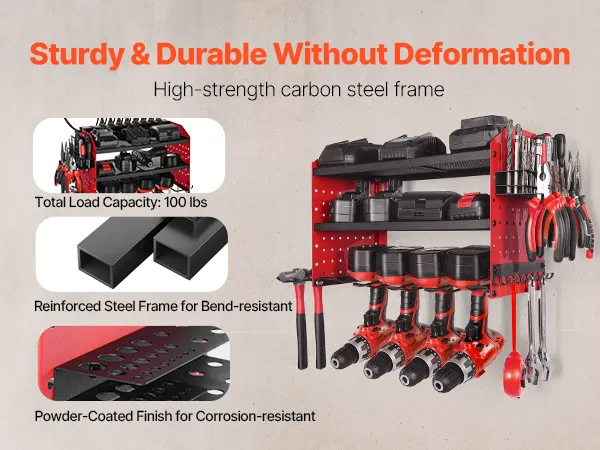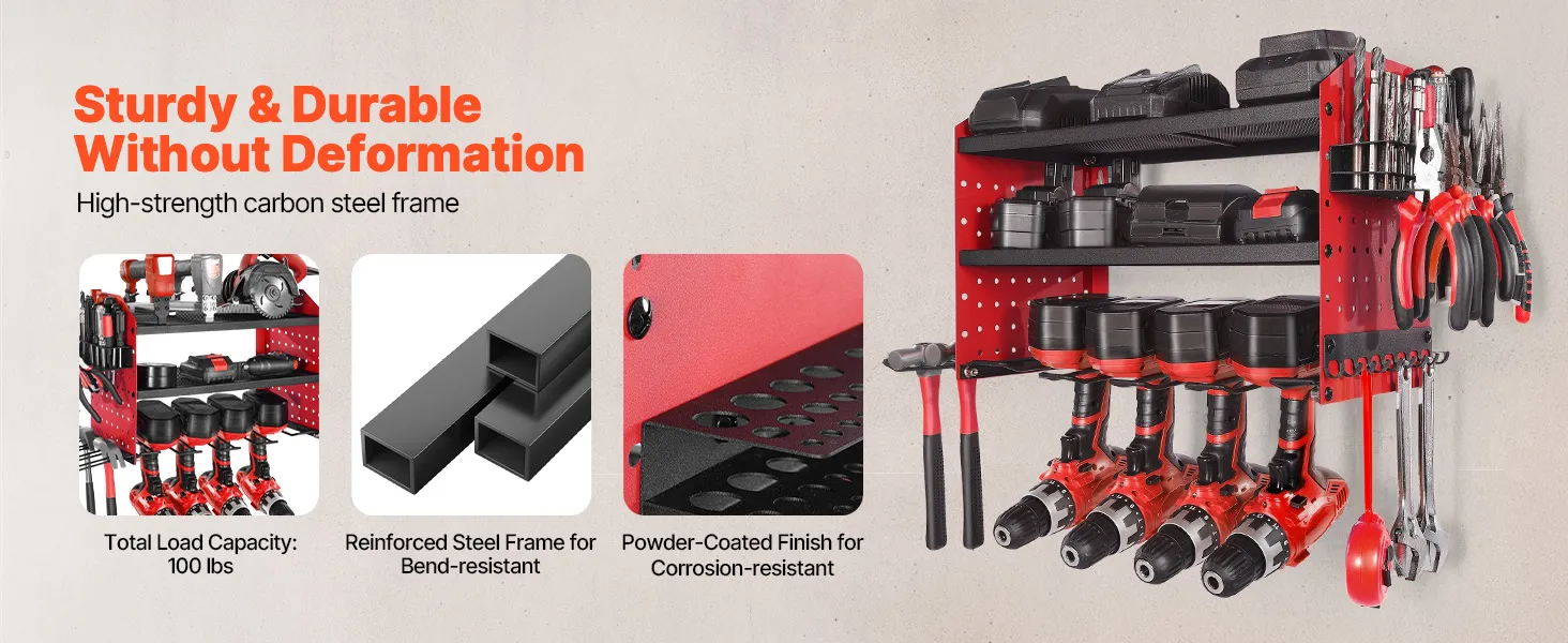 • Sturdy & Durable: Premium carbon steel frame of the power tool storage rack supports 100 lbs total (33 lbs per tier). Powder-coated finish resists rust, and mesh shelves improve airflow to keep tools cool