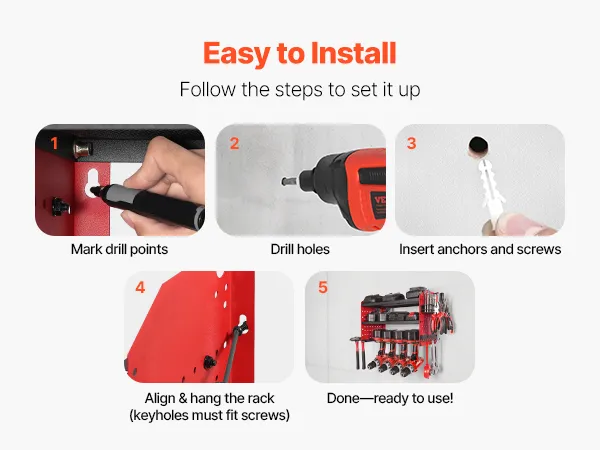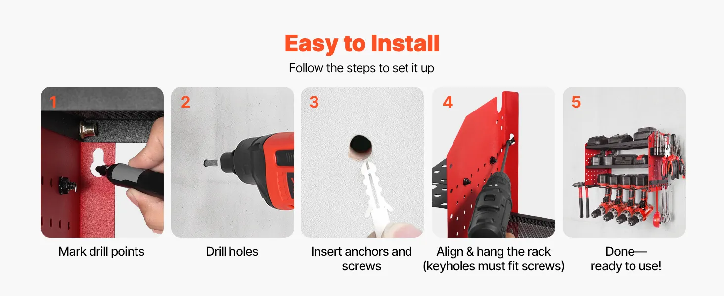 • Easy to Install: Our drill organizer includes mounting hardware and simple instructions. Fits concrete, brick, wood, and stud walls. Ideal for workshops, garages, or as a present for DIY lovers