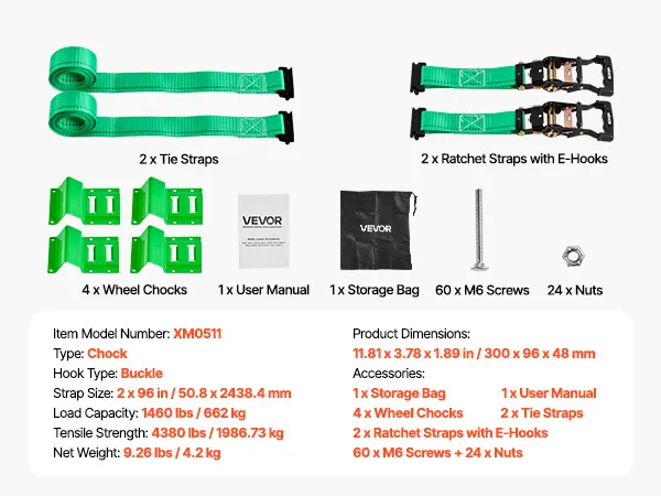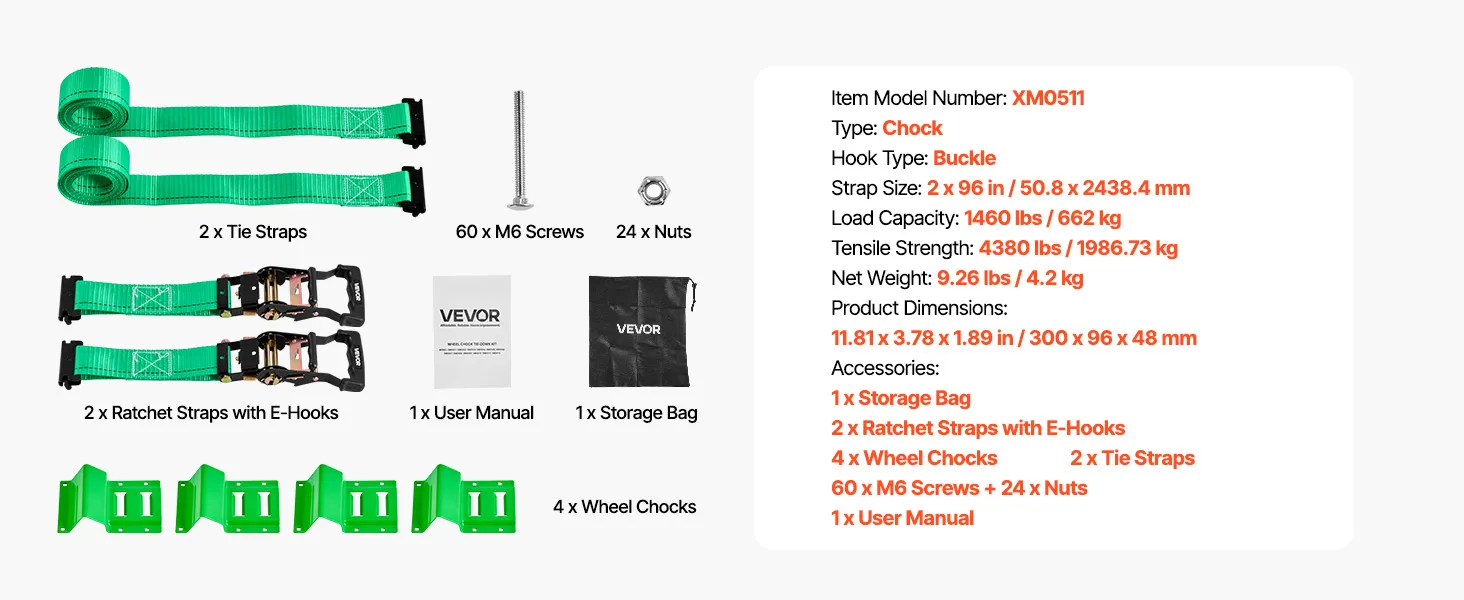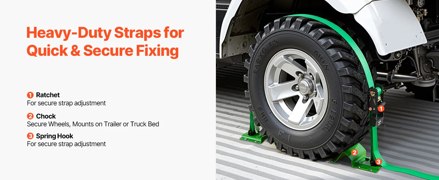 VEVOR Wheel Chock Tie-Down Kit, Chock-Style Trailer Tie Down Strap, Car Tie Down Kit with Buckle, Break Strength 1986.73 kg & Working Load 662 kg Motorcycle Tie-Down System for ATVs, UTVs & Trailers