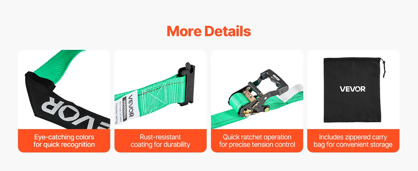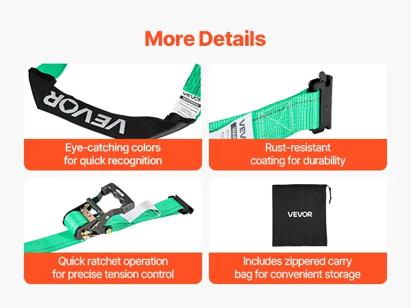 Featuring an eye-catching bright color design, this car tie down strap is easy to see and operate. The rust-resistant surface ensures durability, while the zipper storage bag is portable and easy to store for reliable use.