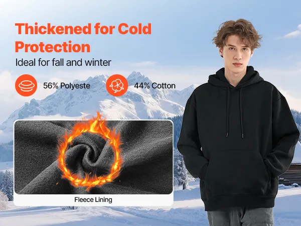 We use a 56% polyester and 44% cotton blend. The fleece lining of the hoodie locks in warmth and feels gentle on the skin—ideal for cool fall and winter days.