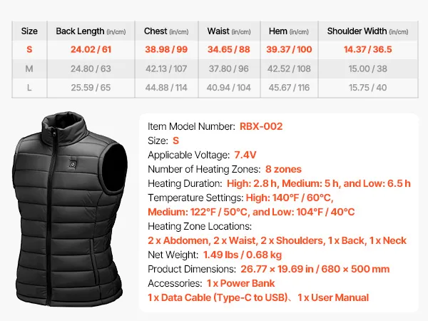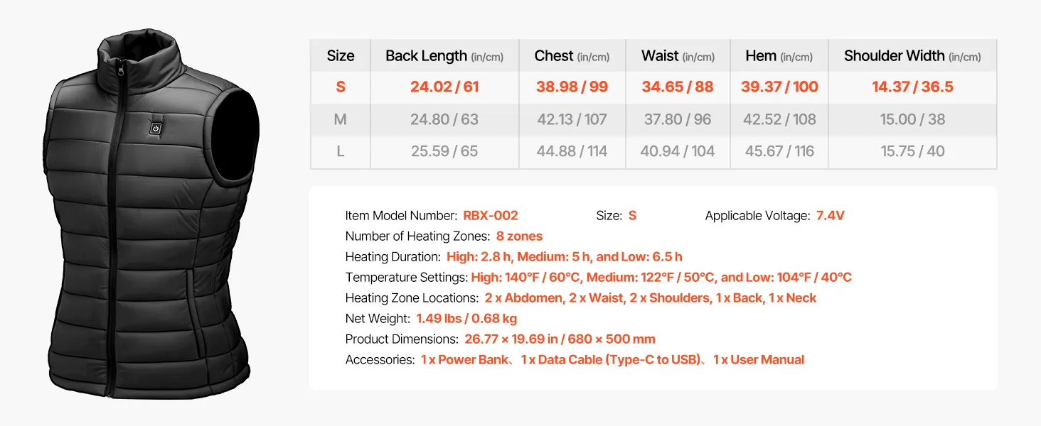 VEVOR Heated Vest, Women Electric Heating Vest with 16000 mAh Battery Pack, 8 Heating Zones Lightweight Rechargeable Winter-Vest with 3 Levels, for Outdoor Hiking Camping Fishing Skiing, Size S