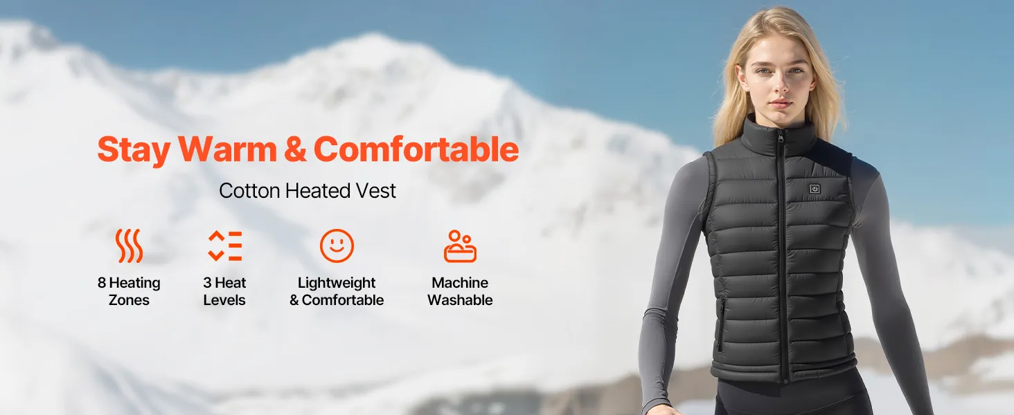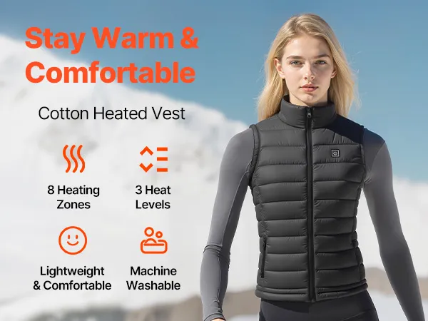 This heated vest comes with 8 heating zones and 3 temperature controls for levels. Its soft fabric ensures a comfortable close-fitting, and the machine-washable design is easy to clean, keeping you warm in winter.