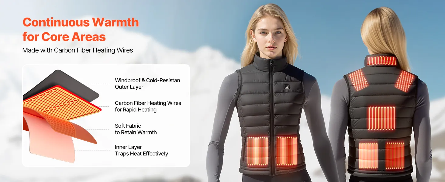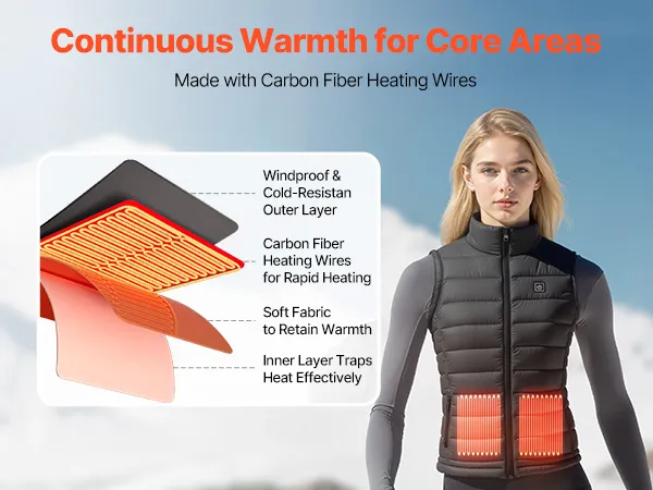 Featuring a windproof and cold-resistant outer layer and a carbon fiber heating wires inner layer, this heated vest for women distributes heat more evenly and heats fast. Its soft thermal fabric locks in heat for better warmth effect.