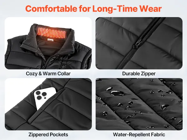 Equipped with a comfortable thermal collar, smooth zipper, waterproof fabric, and zippered pockets, this heating vest enhances wearing convenience and outdoor practicality.