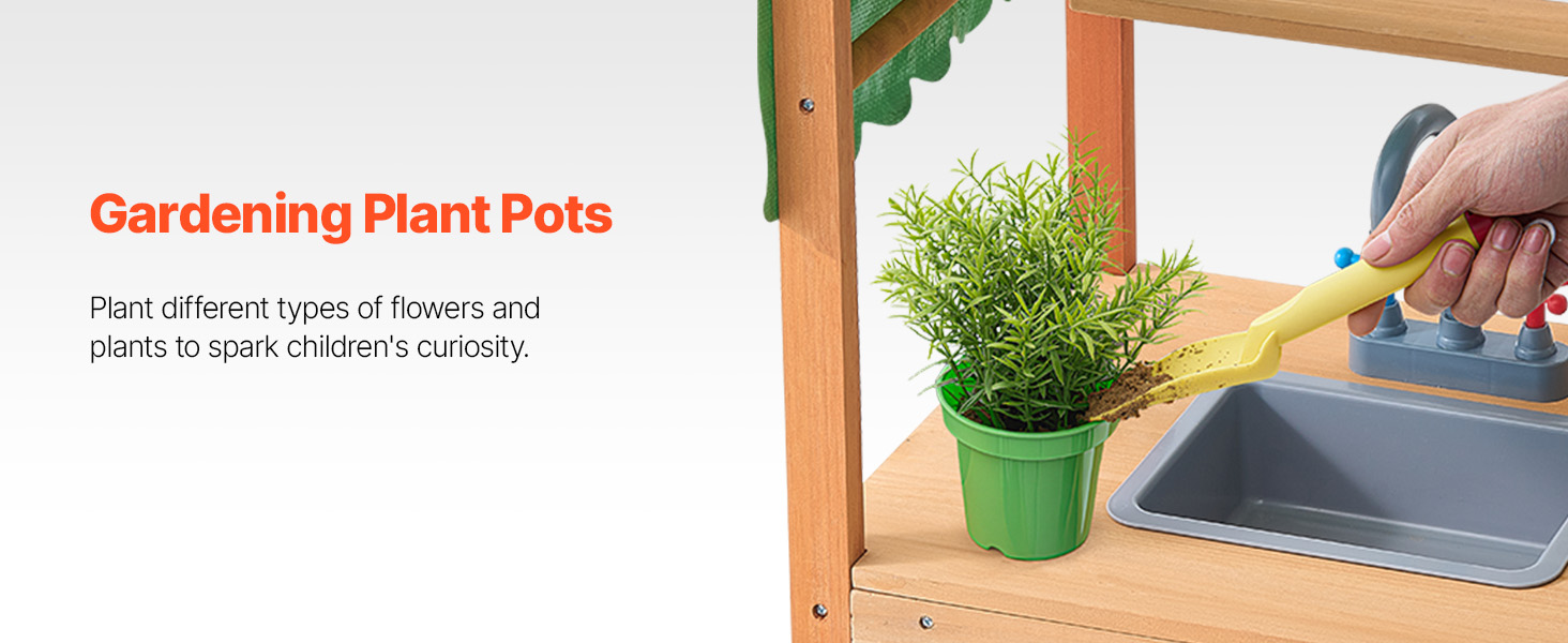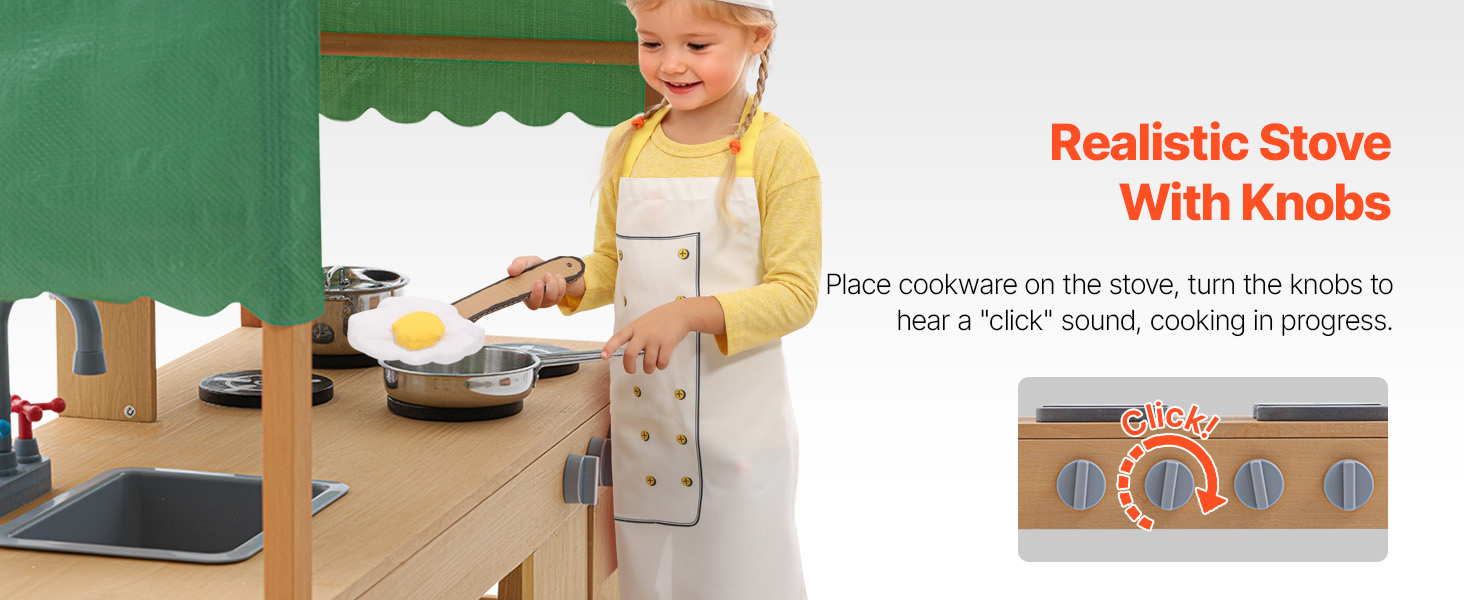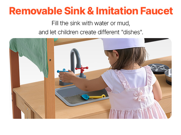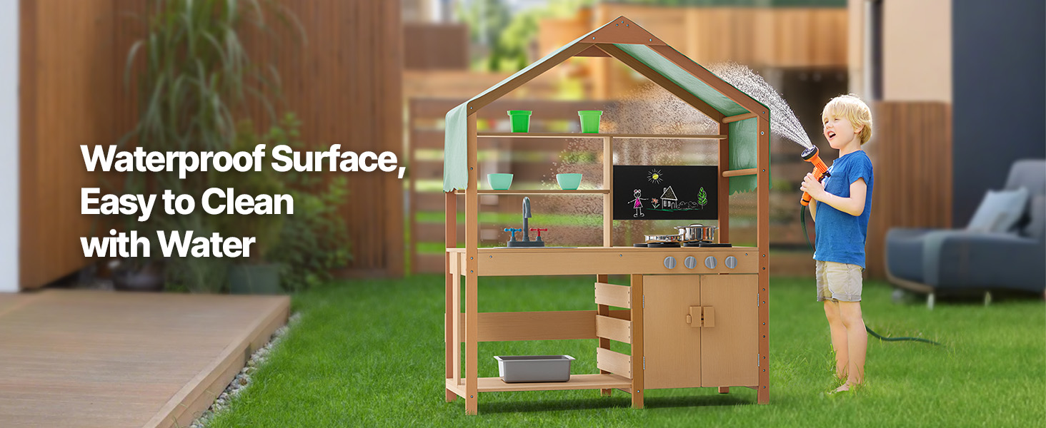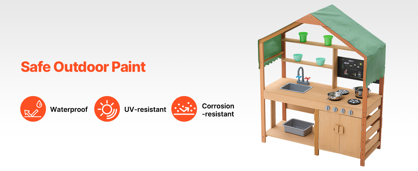 This toddler play kitchen is treated with outdoor-grade paint for water and corrosion resistance, providing a shaded area for kids to play. It's perfect for use in gardens, backyards, and lawns.