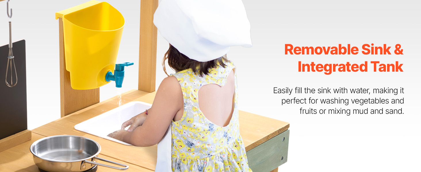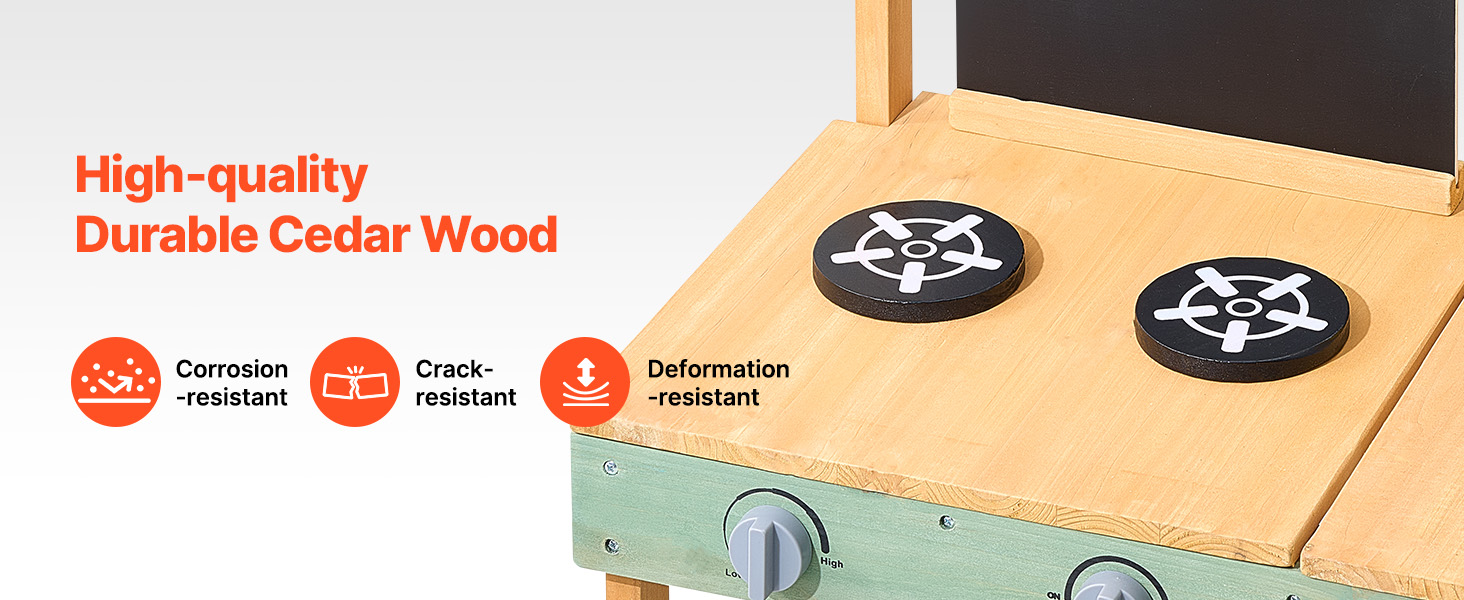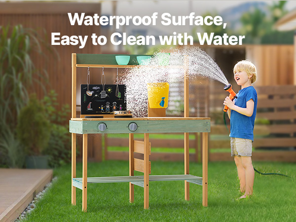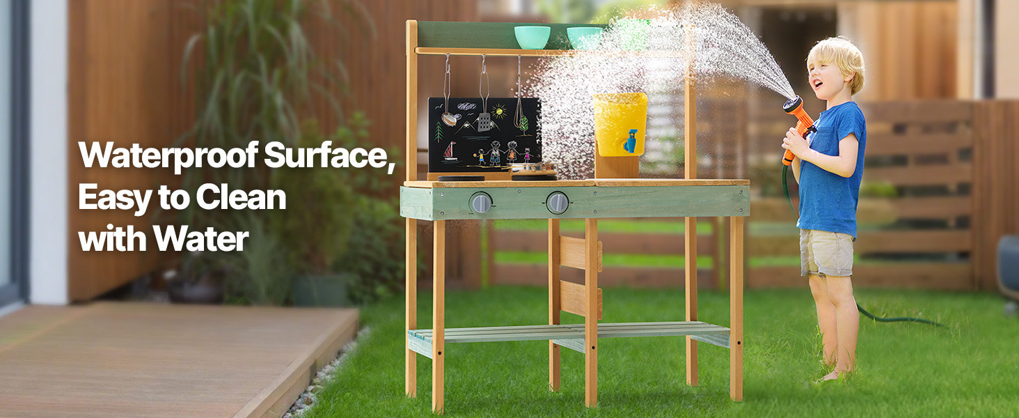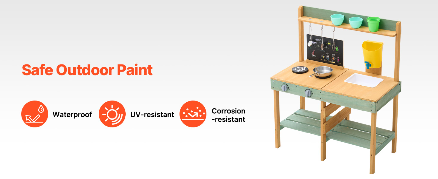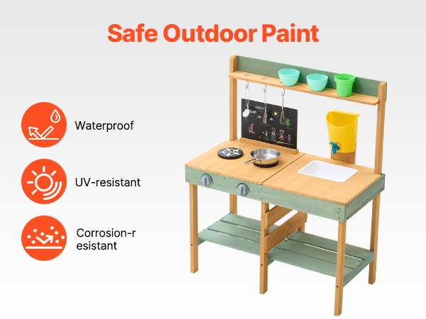 This imaginative toddler play kitchen is treated with outdoor-grade paint for water and corrosion resistance, making it ideal for outdoor environments like gardens, backyards, and lawns.